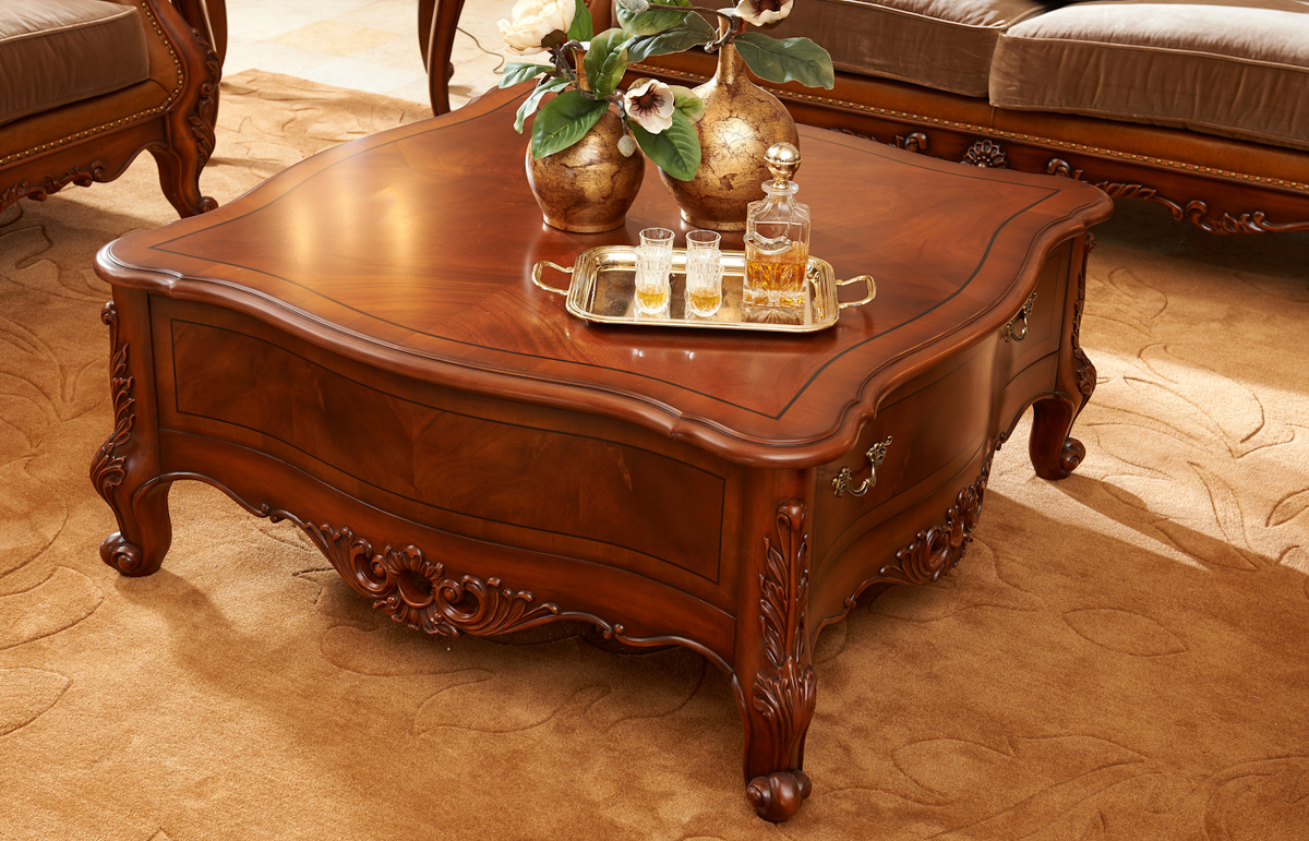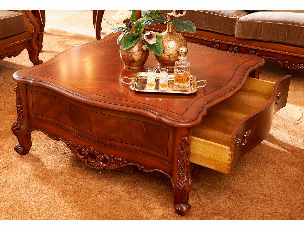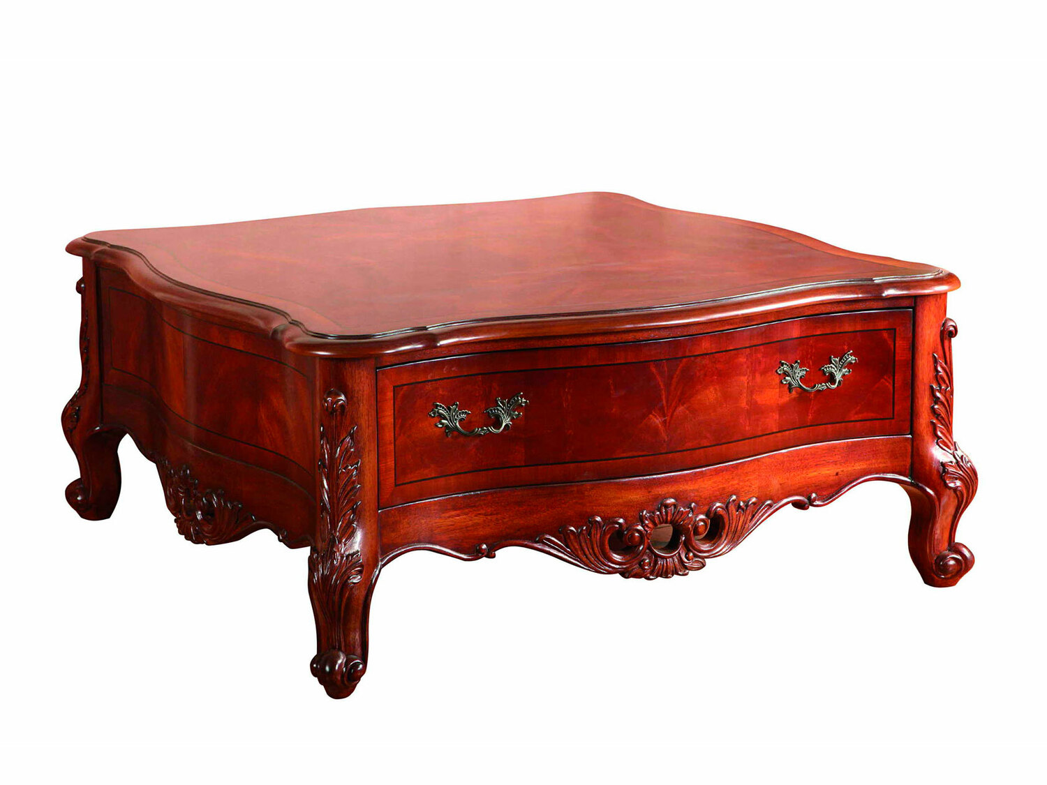 Предлагаем купить роскошный, квадратный, классический журнальный стол из массива дерева с ящиком. Цвет: орех с античной патиной. Блеск поверхности - шелковистый. Исключительное качество производства. Продажа классической мебели премиум класса из массива дерева.