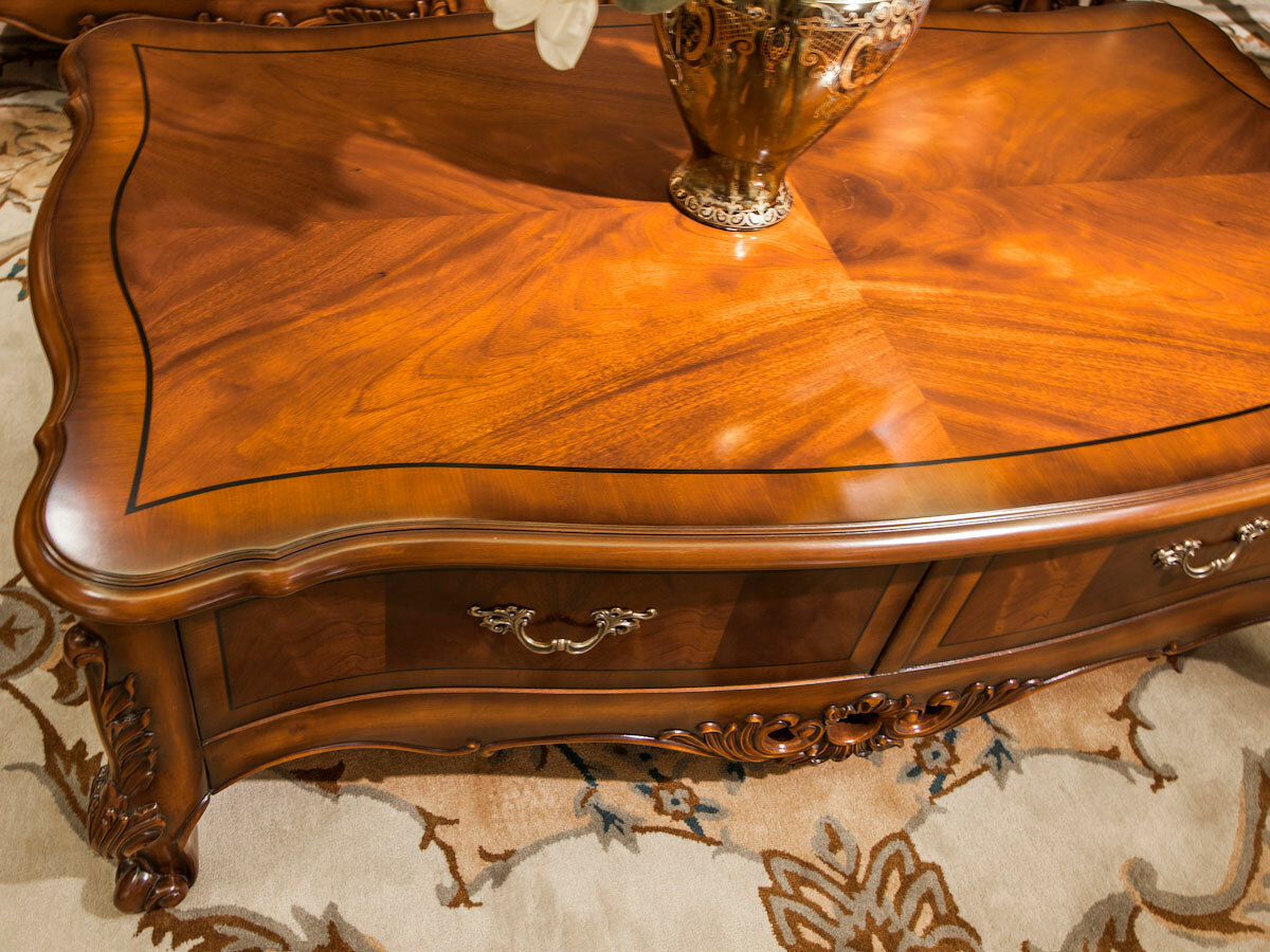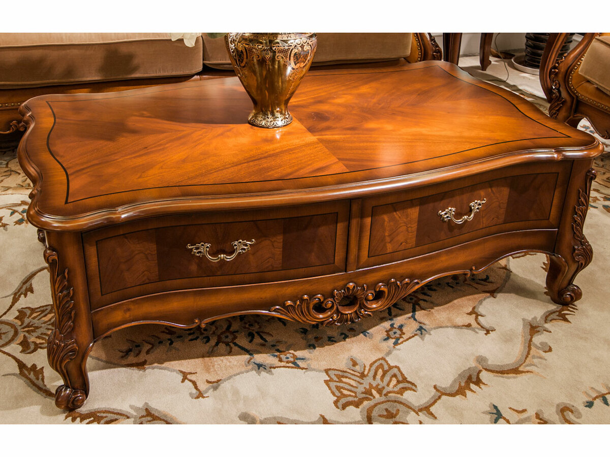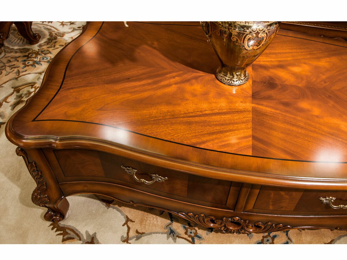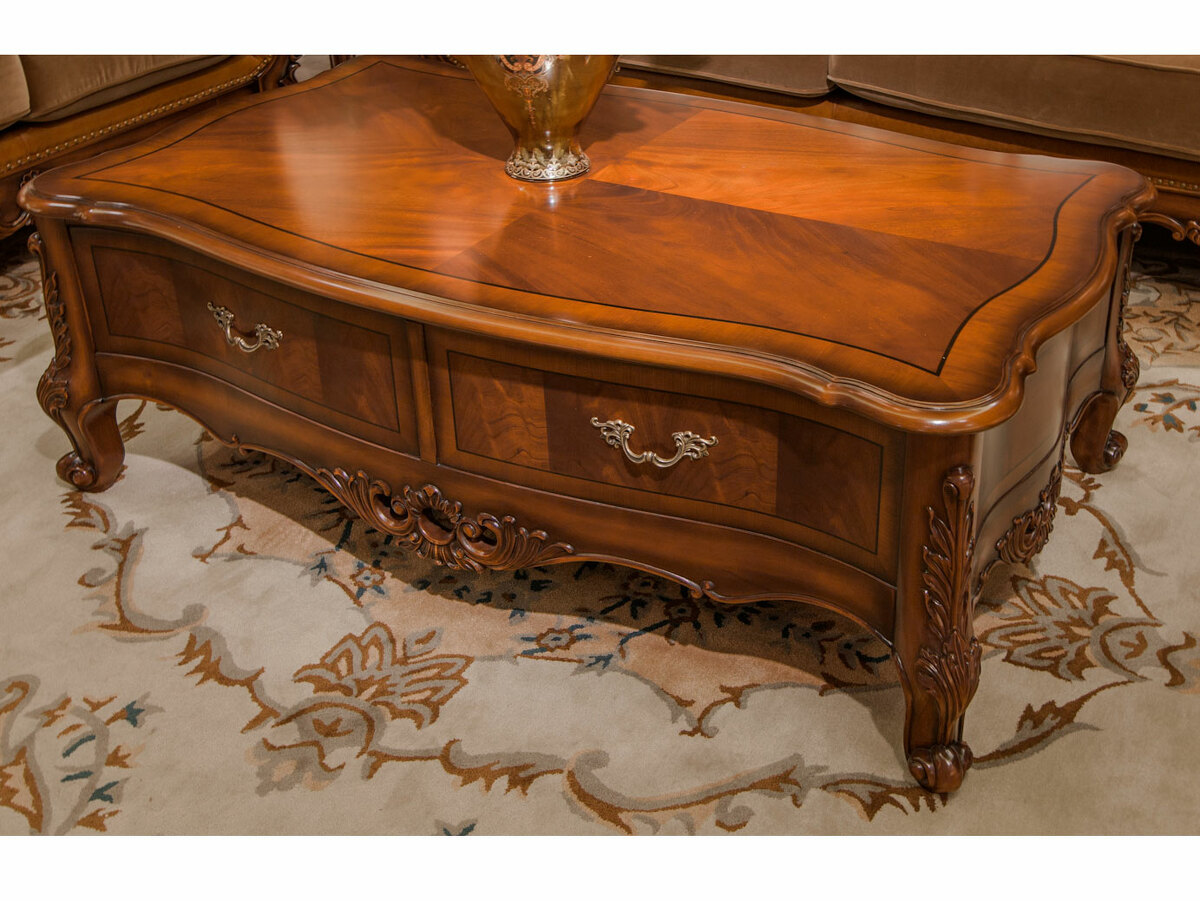 Предлагаем купить роскошный, прямоугольный, классический журнальный стол из массива дерева с ящиком. Цвет: орех с античной патиной. Блеск поверхности - шелковистый. Исключительное качество производства. Продажа классической мебели премиум класса из массива дерева.