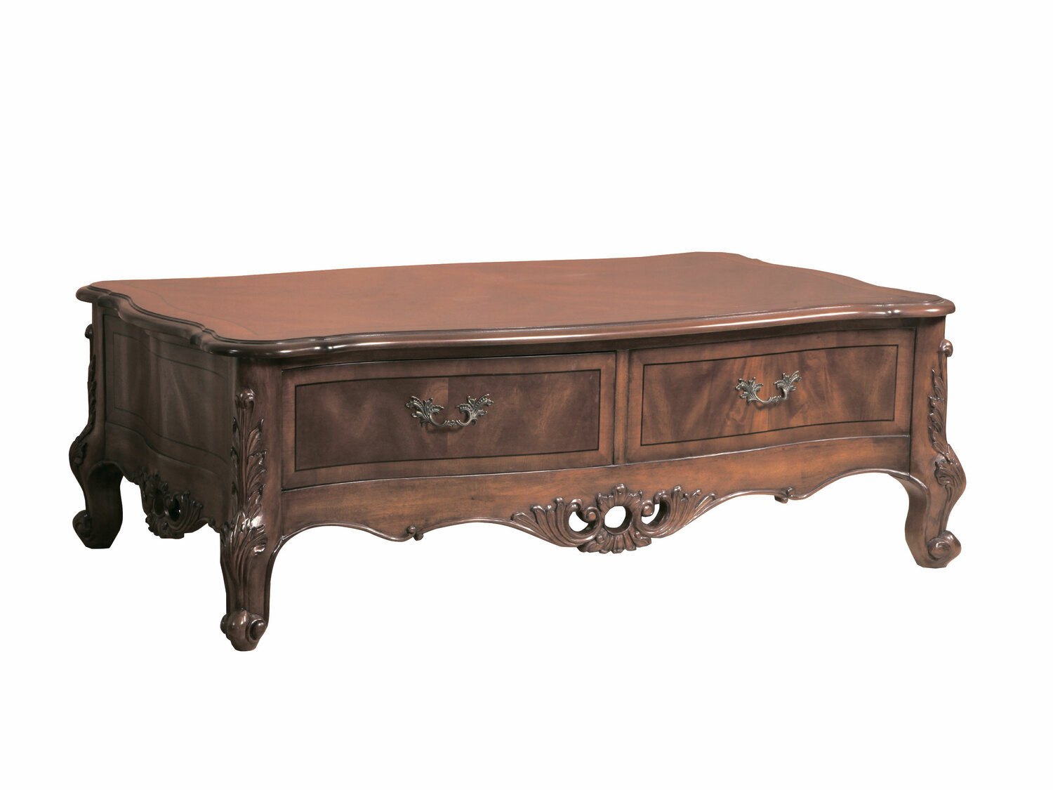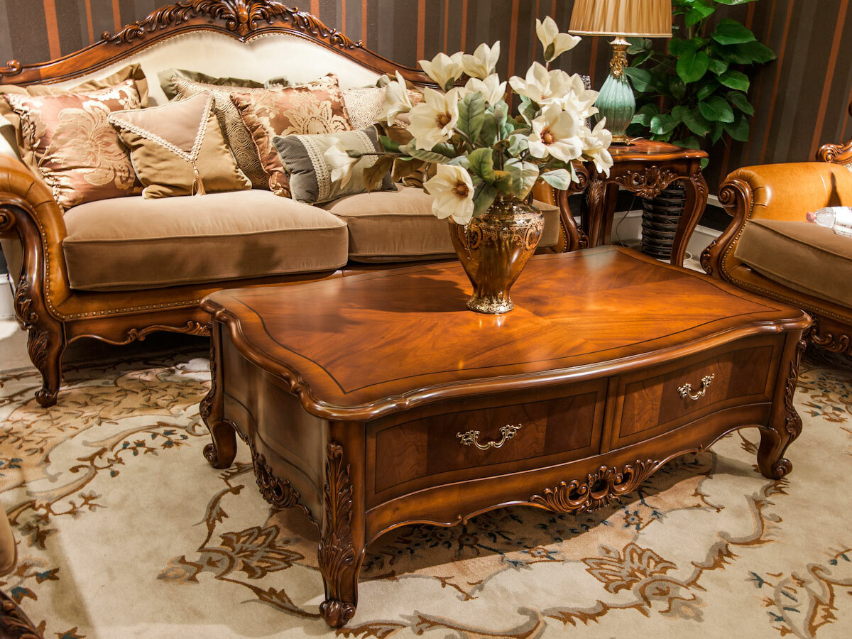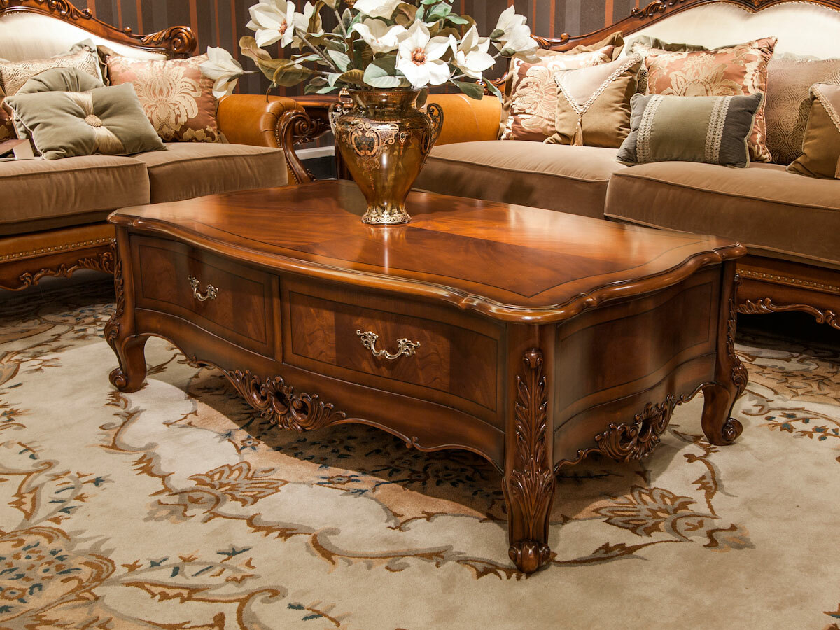 Предлагаем купить роскошный, прямоугольный, классический журнальный стол из массива дерева с ящиком. Цвет: орех с античной патиной. Блеск поверхности - шелковистый. Исключительное качество производства. Продажа классической мебели премиум класса из массива дерева.