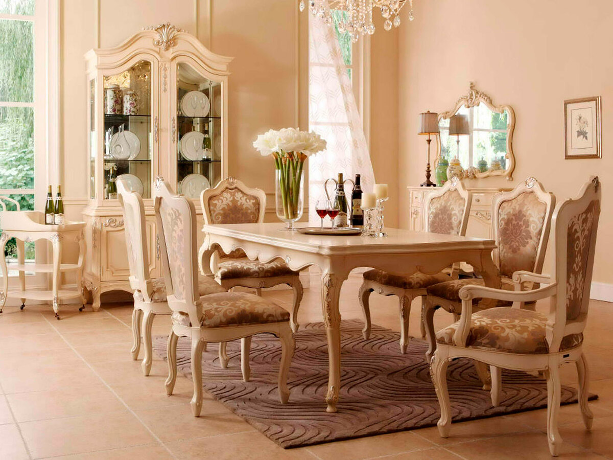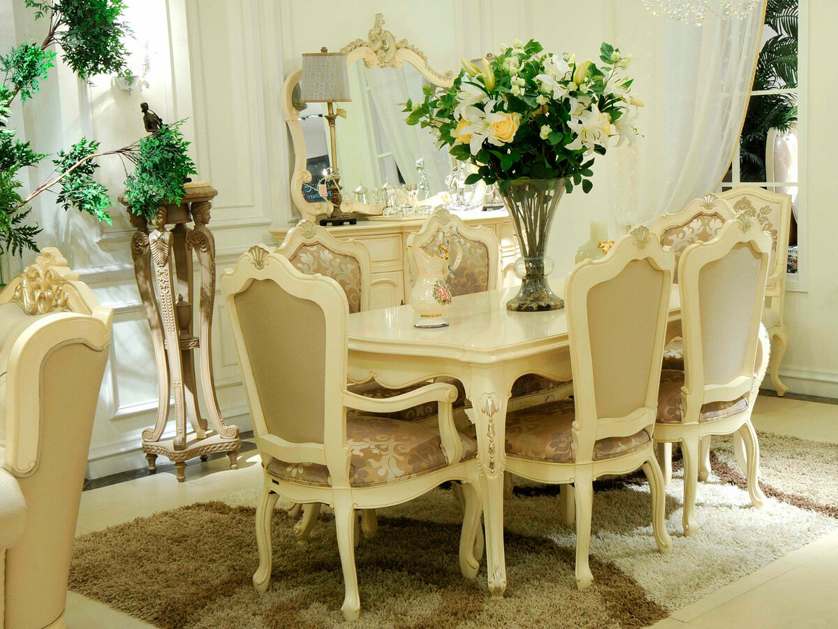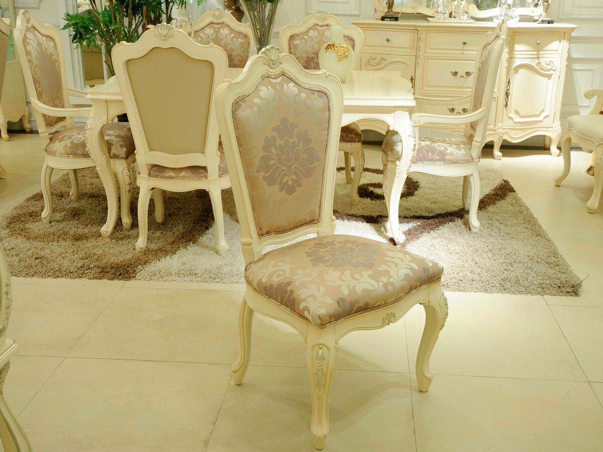 Предлагаем красивые классические обеденные стулья из массива красного дерева с различной обивкой - разные ткани и кожи на заказ, а также различные обеденные столы в данной коллекции. Мебель безупречного уровня качества. Цвет: слоновая кость с серебряной, или золотой поталью. Возможны и другие расцветки на заказ. Блеск поверхности - шелковистый. В данной коллекции также есть буфеты и витрины для посуды, тумбы под телевизор, чайная тележка. Продажа красивых классических обеденных столов и стульев премиум класса.
