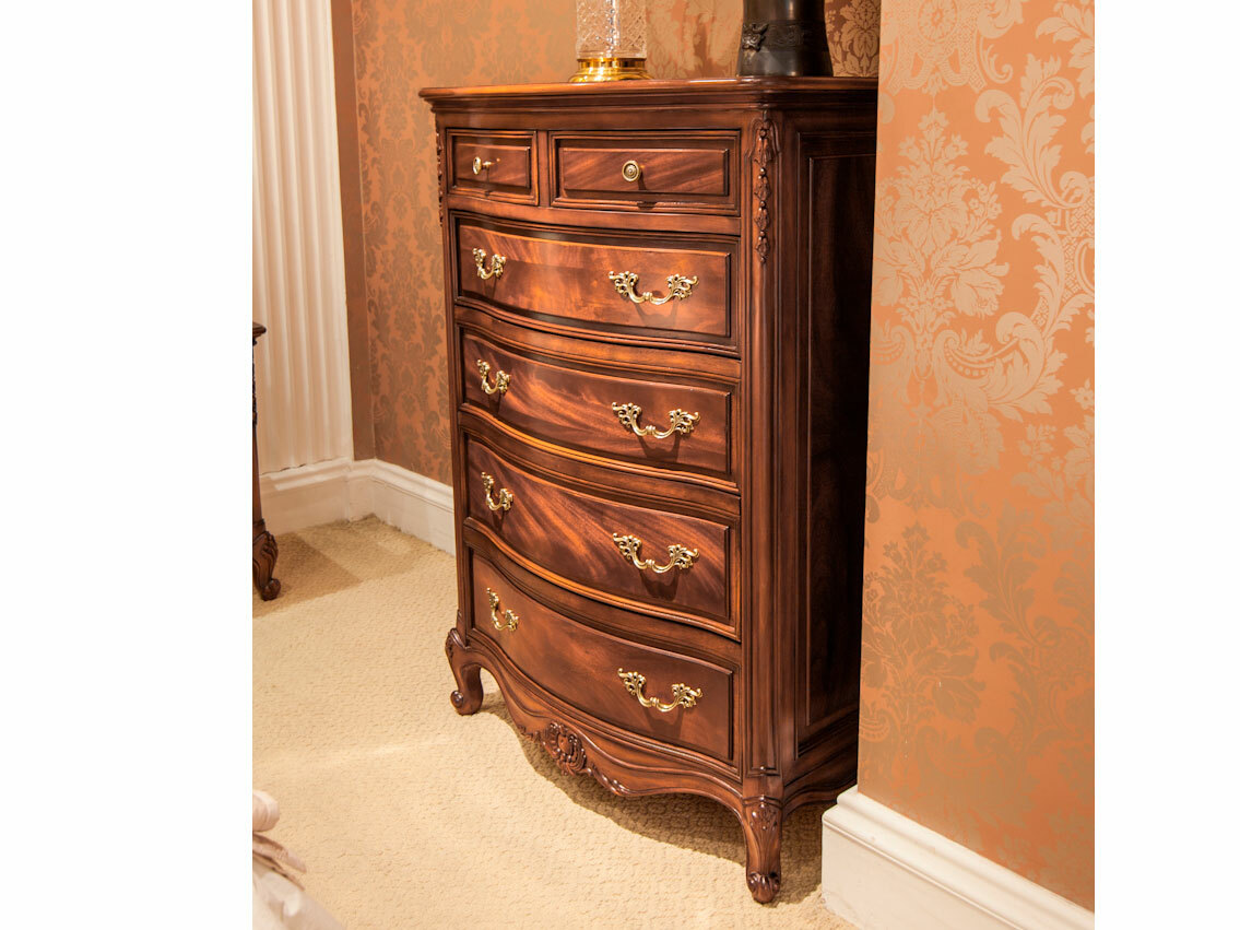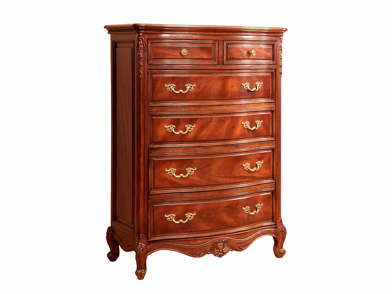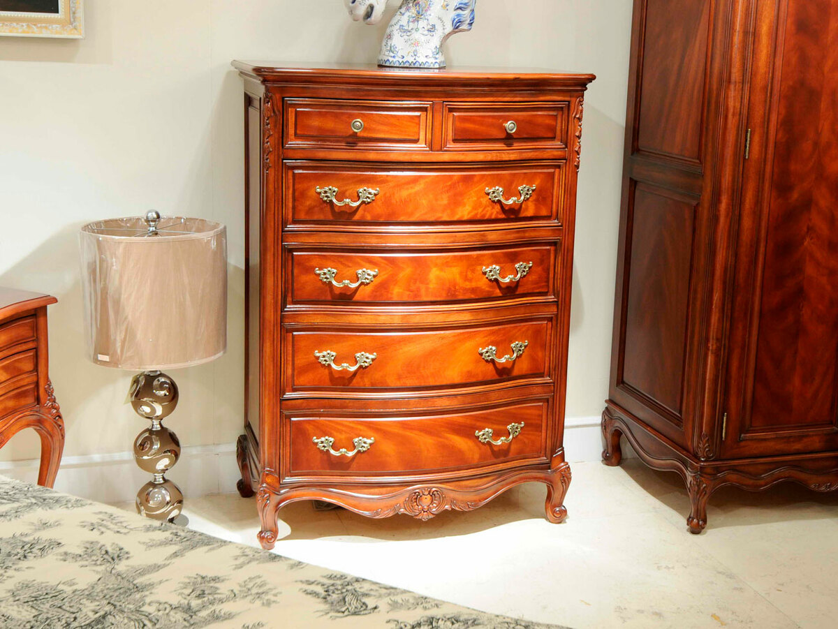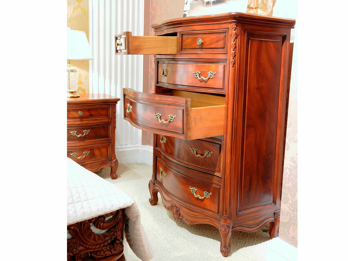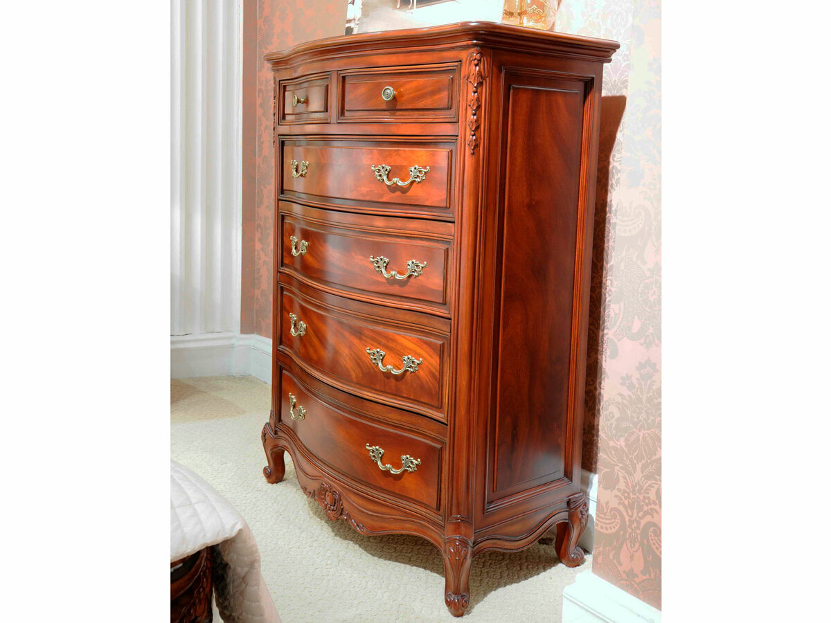 Предлагаем купить красивый, высокий классический комод из массива красного дерева. К данному комоду можно купить комплект мебели для классической спальни из этой же коллекции. Исключительное качество производства. Цвет: орех с античной патиной. Блеск поверхностей - шелковистый. Этот комод также может быть предложен и в цвете слоновая кость с золотой, или серебряной поталью. Продажа красивых классических комодов премиум класса.