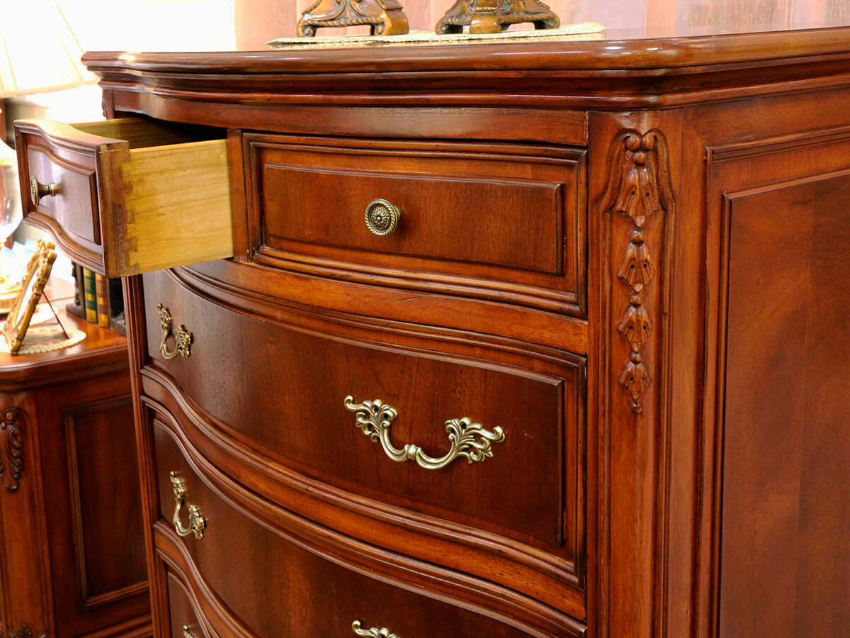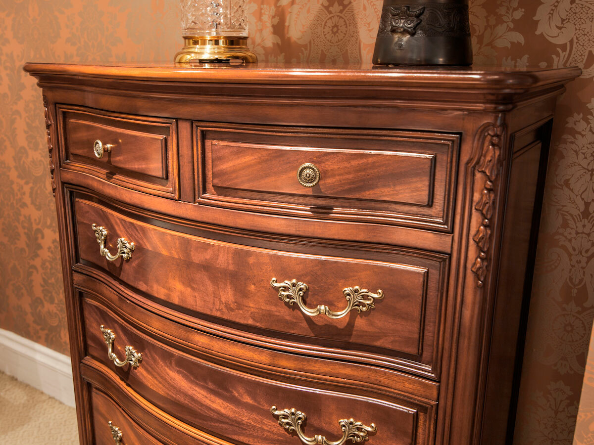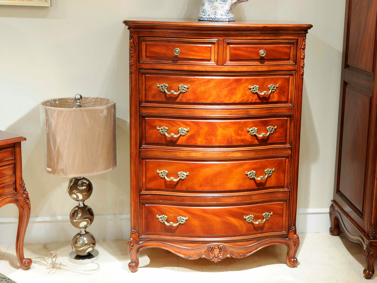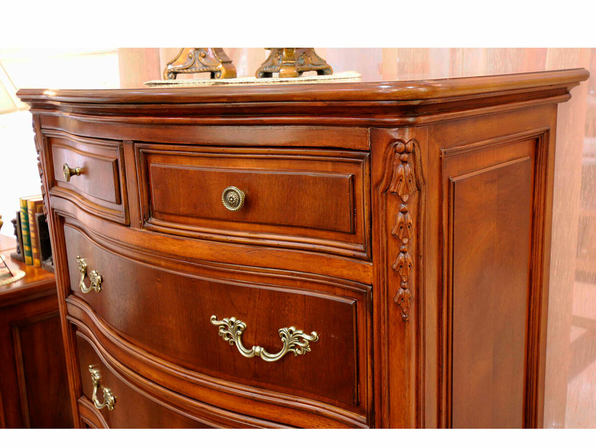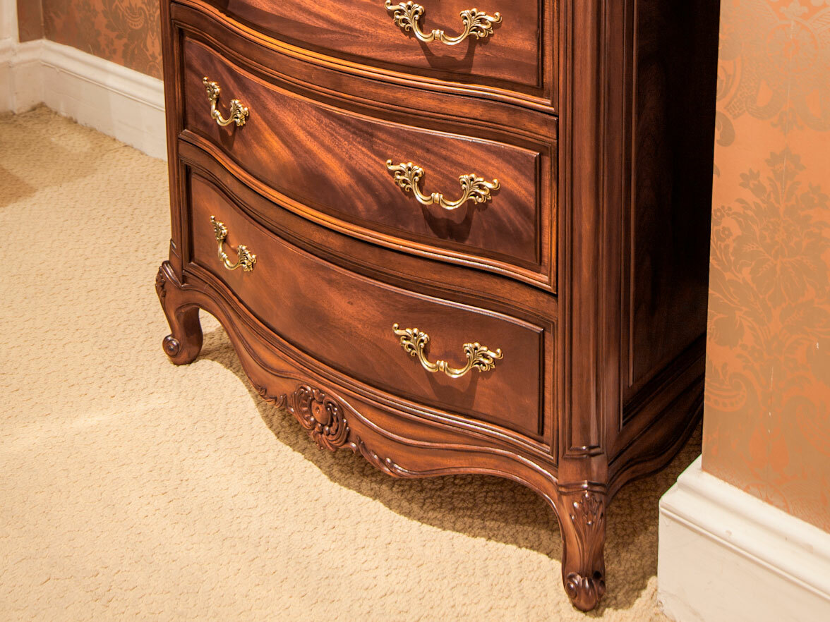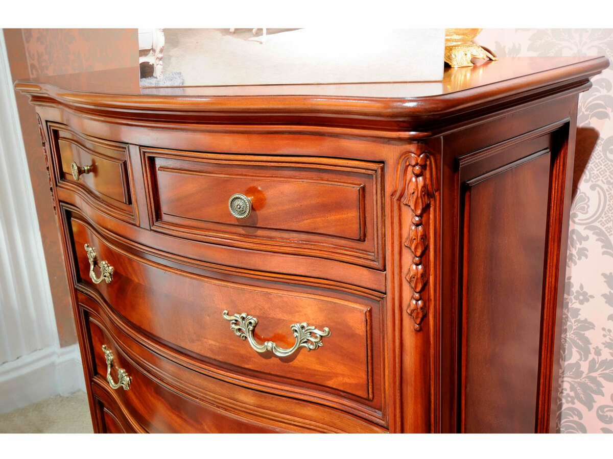 Предлагаем купить красивый, высокий классический комод из массива красного дерева. К данному комоду можно купить комплект мебели для классической спальни из этой же коллекции. Исключительное качество производства. Цвет: орех с античной патиной. Блеск поверхностей - шелковистый. Этот комод также может быть предложен и в цвете слоновая кость с золотой, или серебряной поталью. Продажа красивых классических комодов премиум класса.