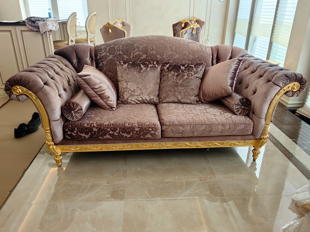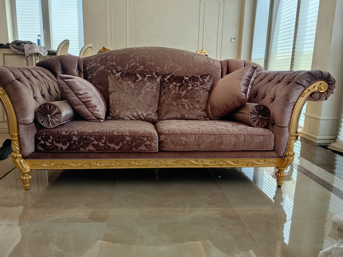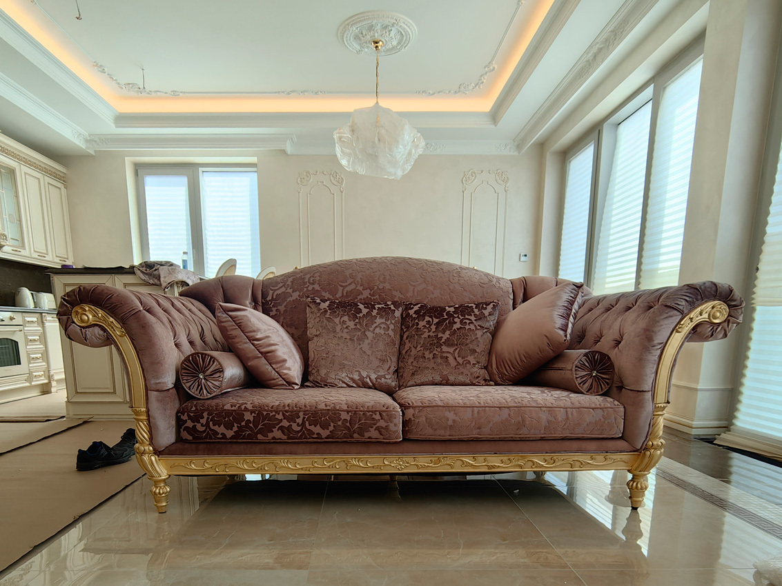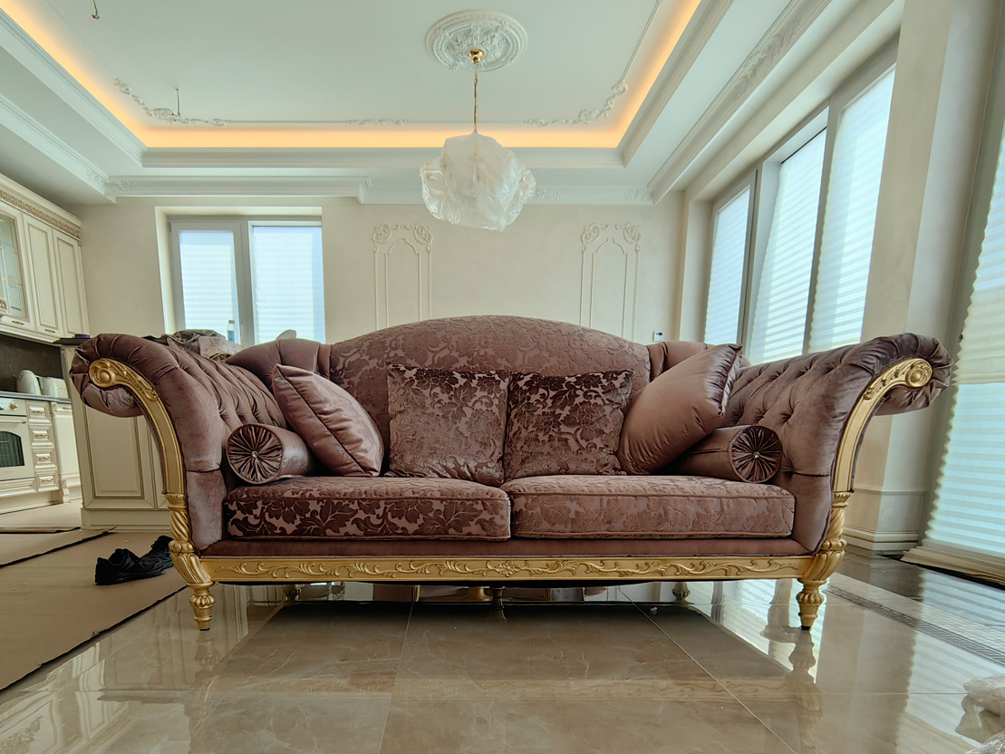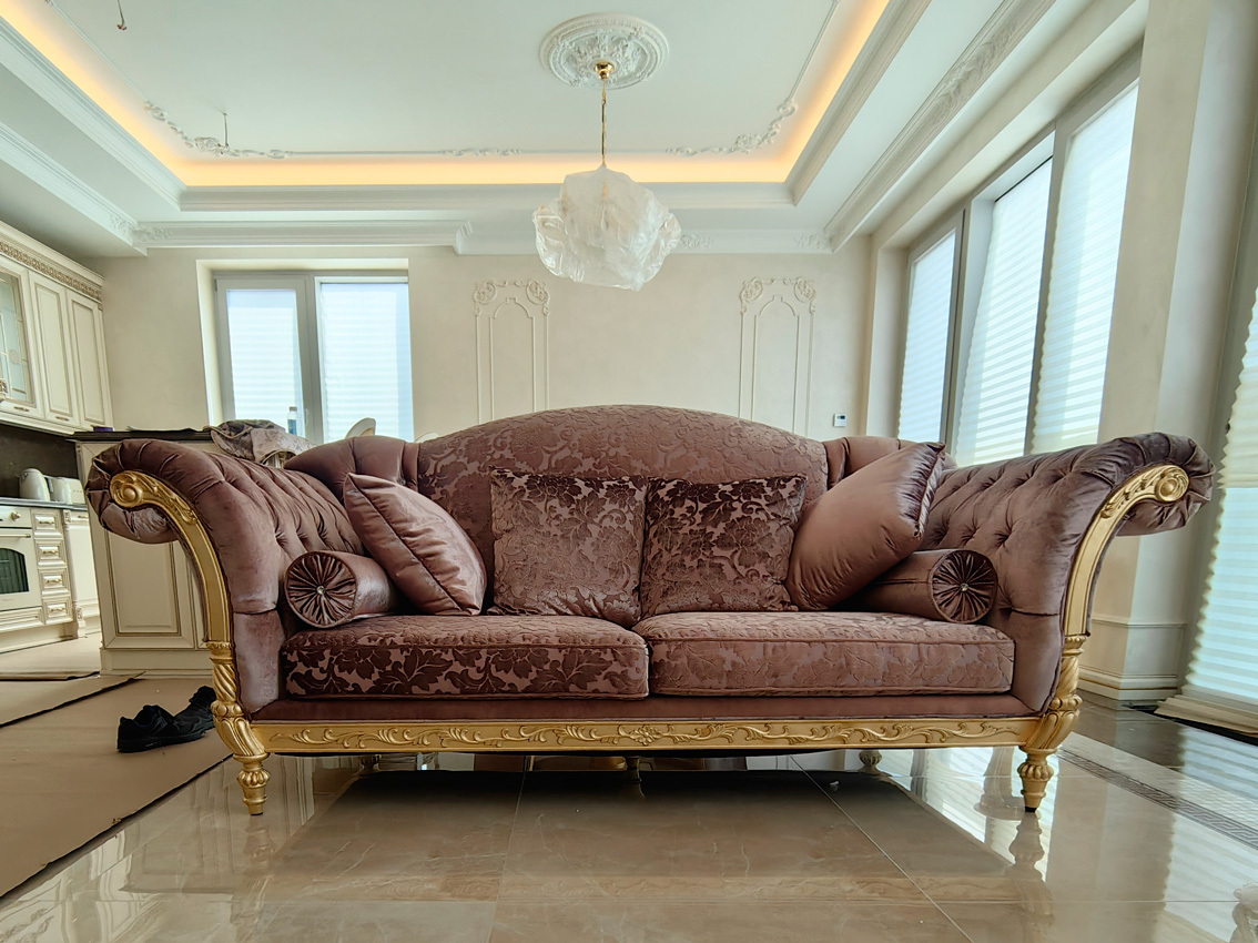 Предлагаем купить красивую реплику классического дивана из дерева фабрики Provasi. Диван выполнен в серебряной потали и переливающихся тканях хамелеон. Диван в наличии в мебельном салоне. Распродажа. Ширина посадочного места - 1670мм, глубина - 730мм. Представленные на фото образцы выполнены в тканях "хамелеон". Подушки поставляются в комплекте (2 валика и 550*500 - 4 шт.). Для облегчения заноса дивана, спинка может отстегиваться. Материалы - массив бука, сусальный серебряный лист, глянцевый лак. Продажа реплик итальянских диванов премиум класса.